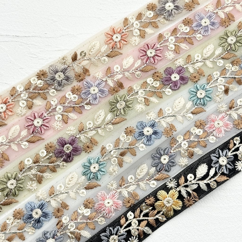 インド刺繍リボンは、細かい刺繍が施されていて色も鮮やかなリボンです。