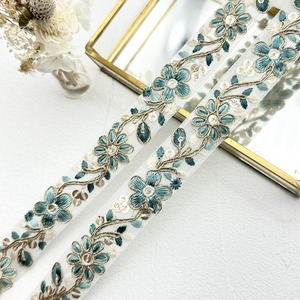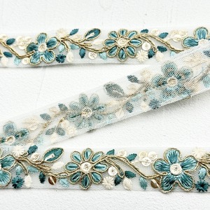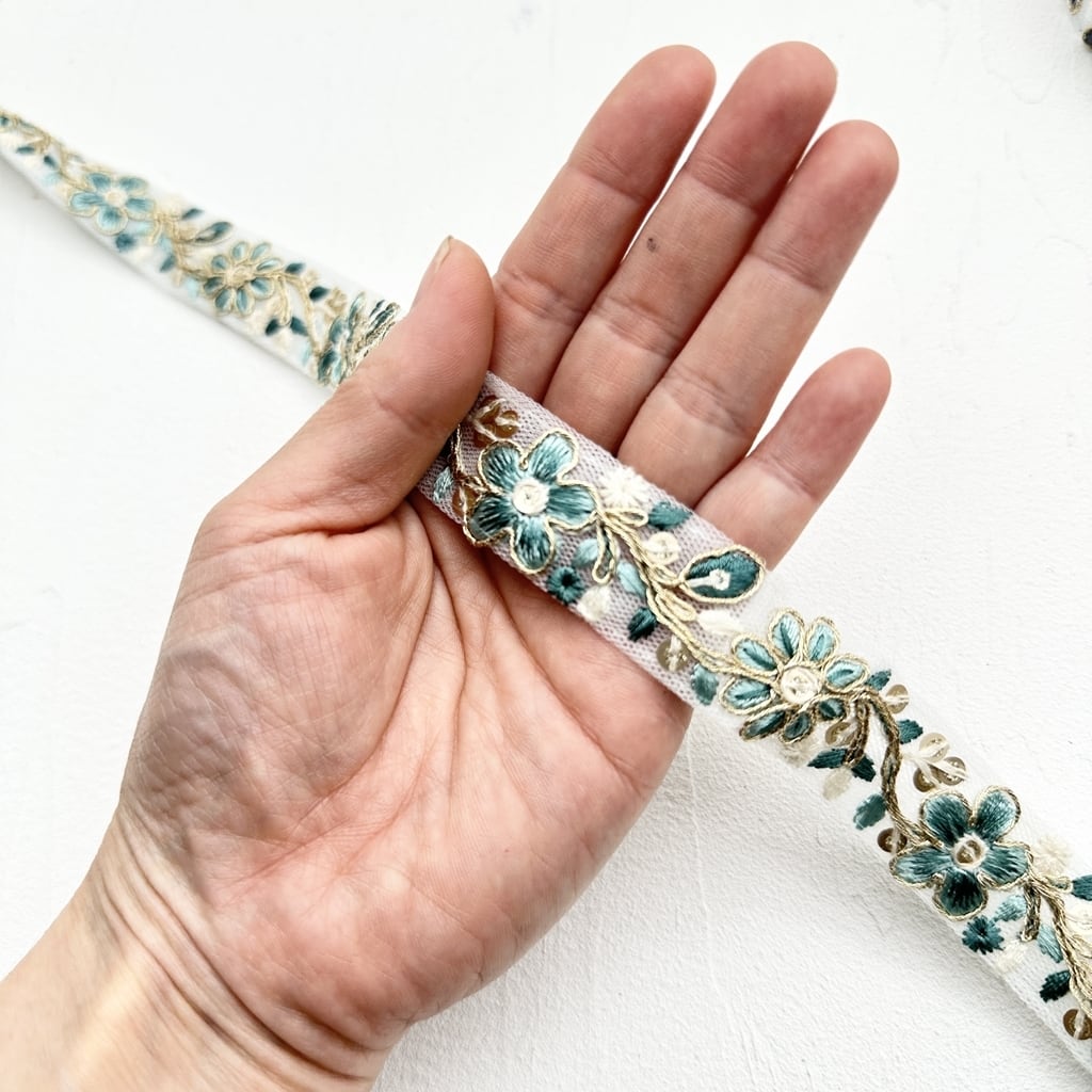 1ロール ロイヤルパステル [エメラルドブルー]インド刺繍リボン 2049-1R