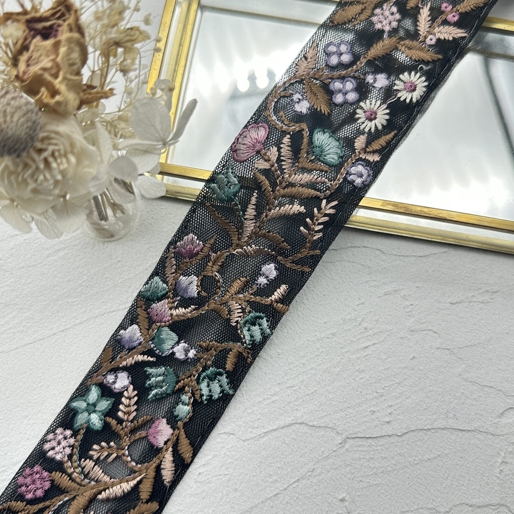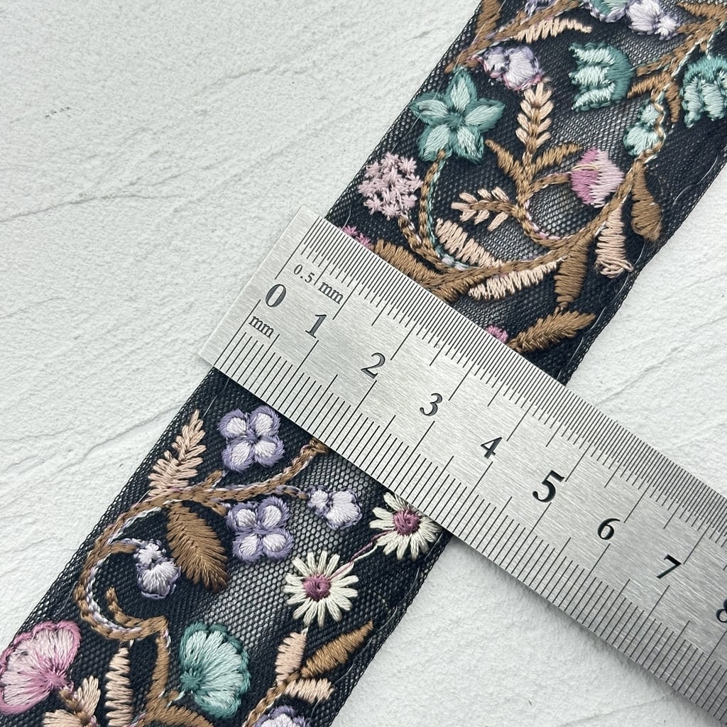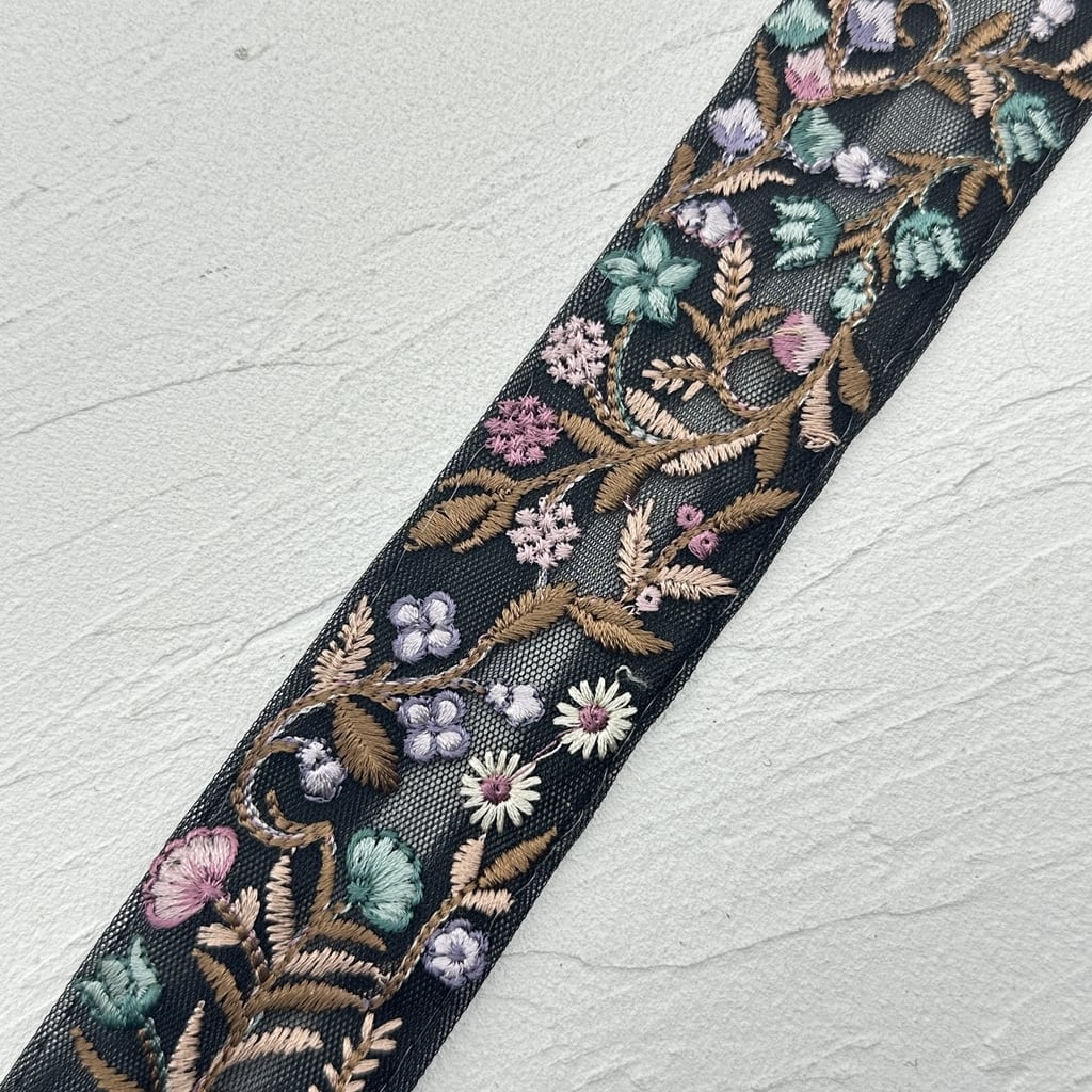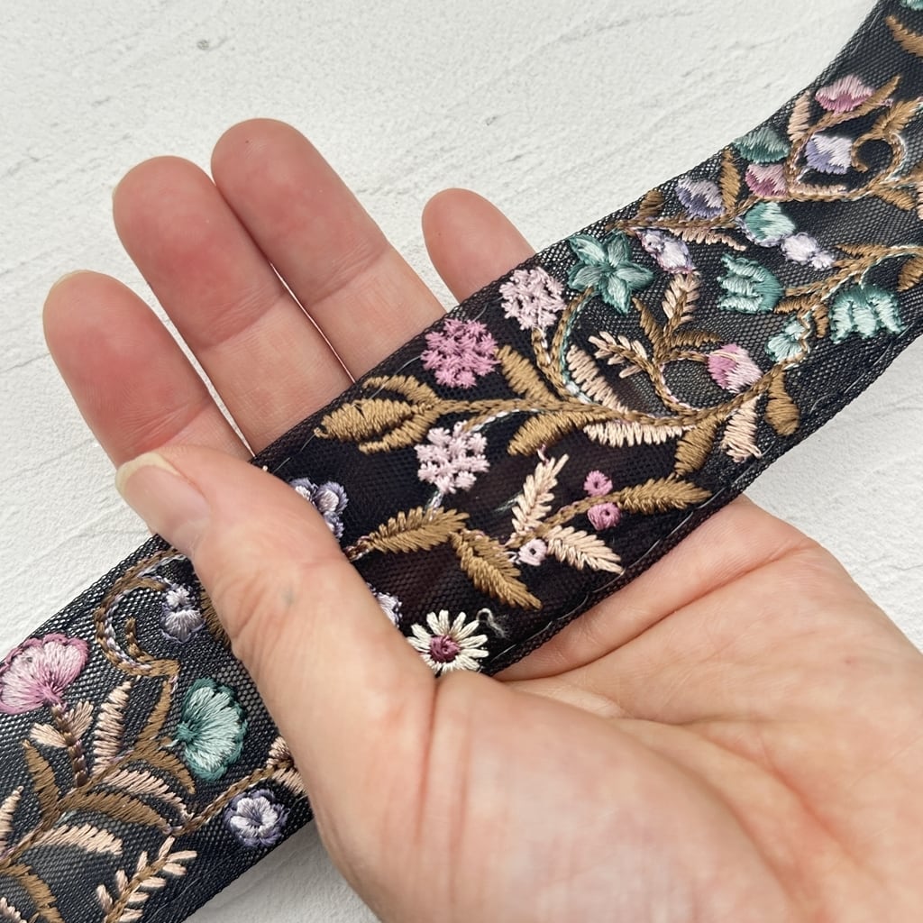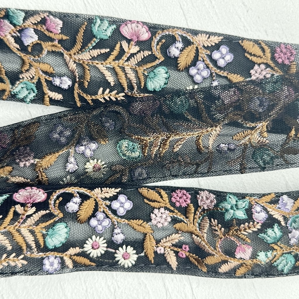 1ロール カラフルブロッサムスリム [ブラック]インド刺繍リボン 3070-1R