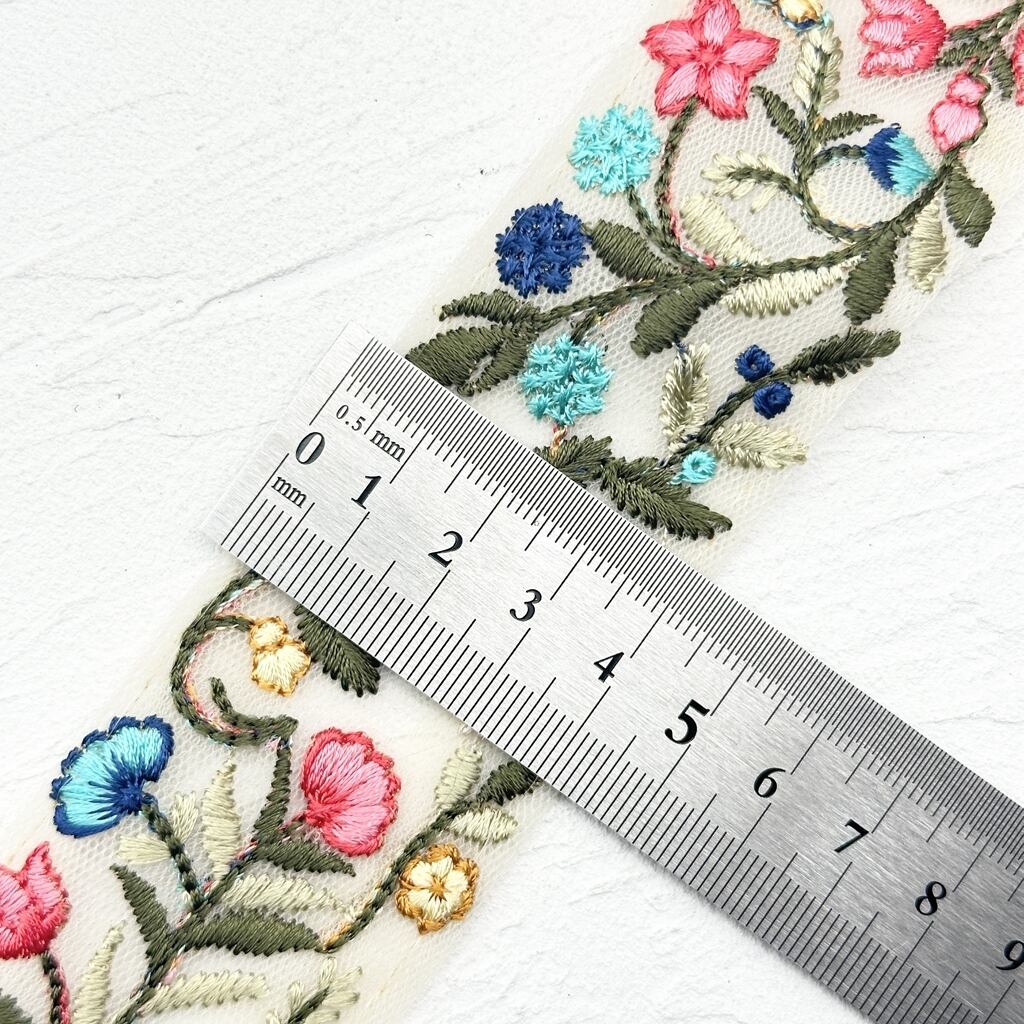 1ロール カラフルブロッサムスリム [レッドブルー]インド刺繍リボン 3075-1R