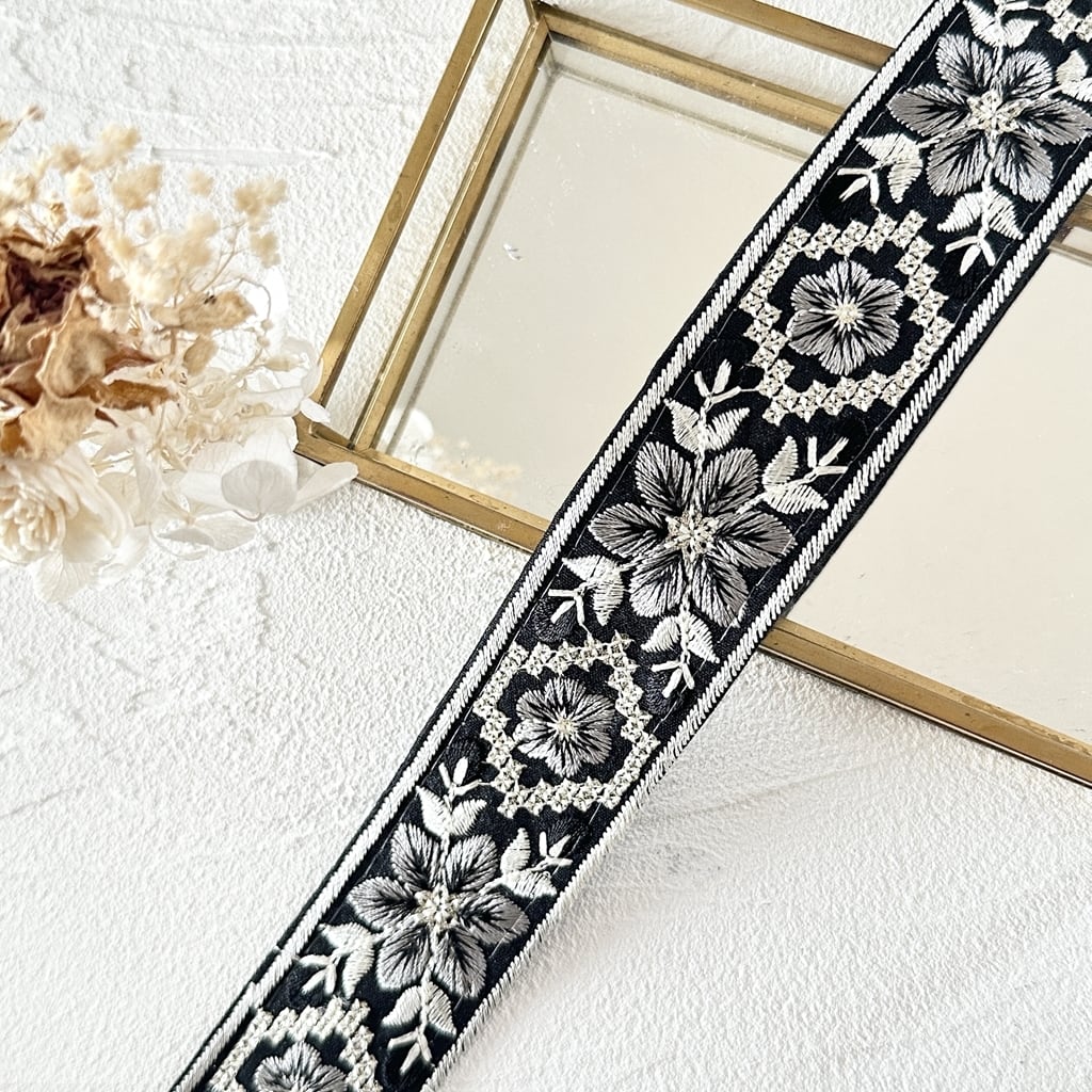 パステルフローラル [布ブラック]インド刺繍リボン 3142