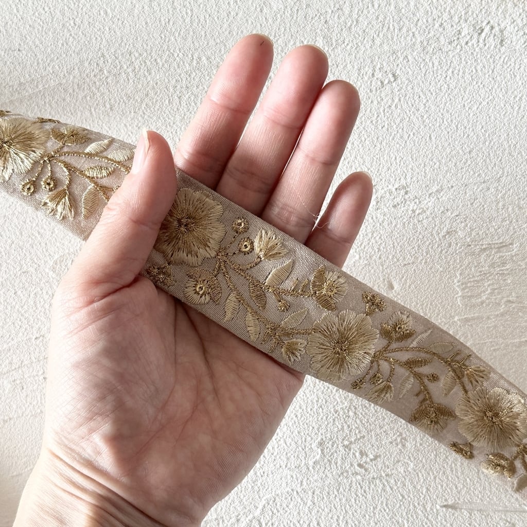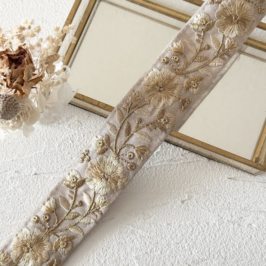 ゴールデンフローレス [グレー] インド刺繍リボン 3344