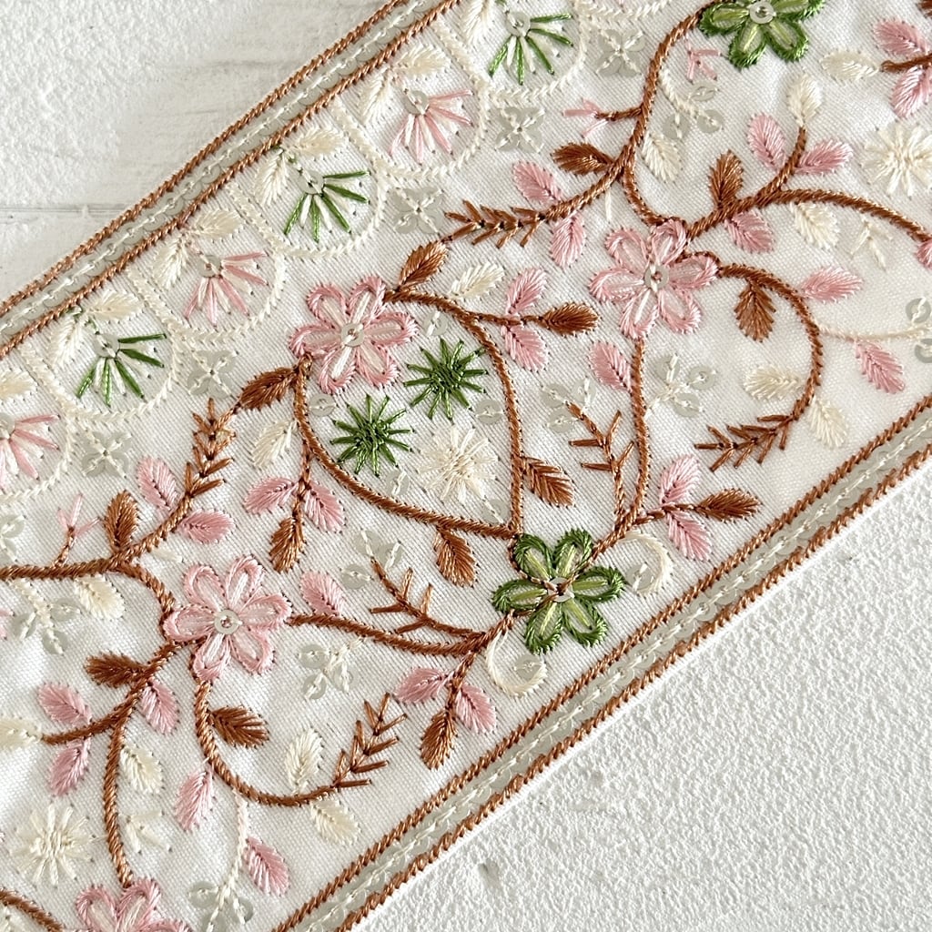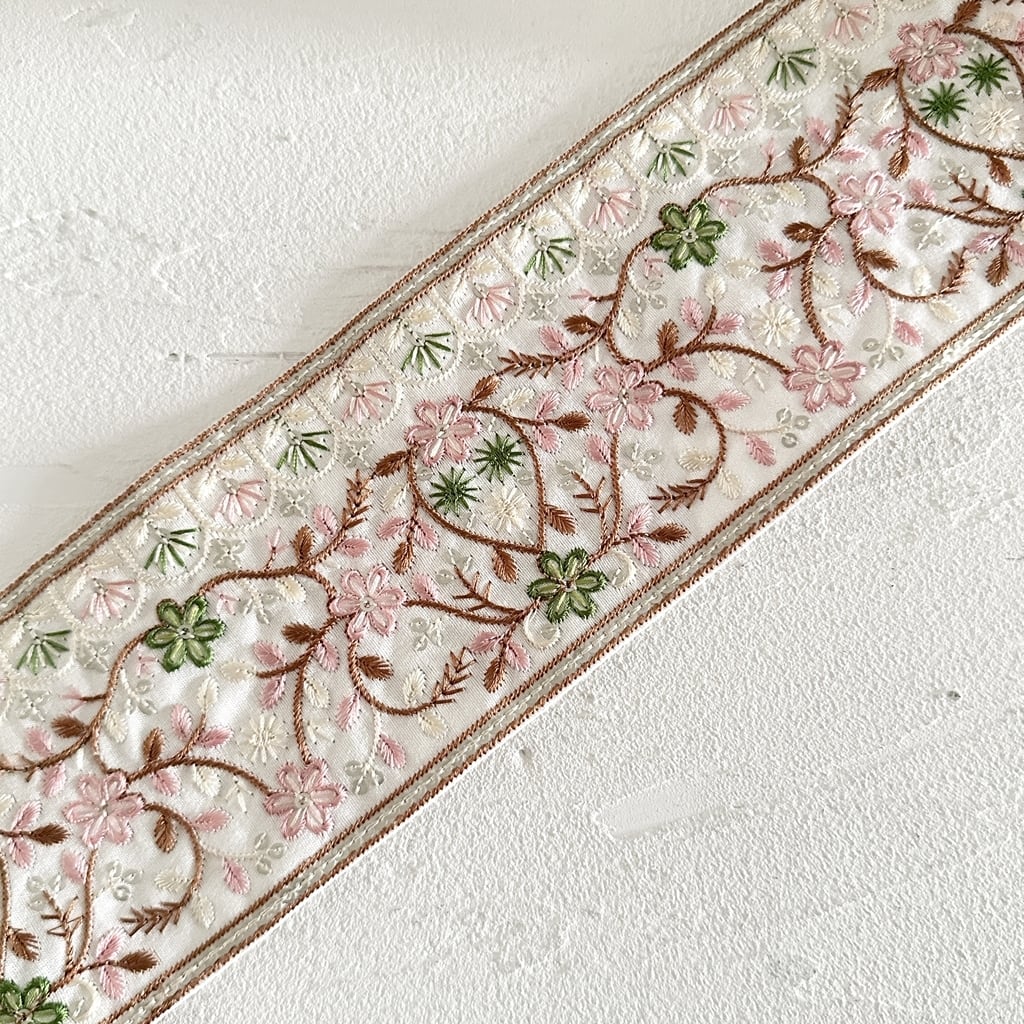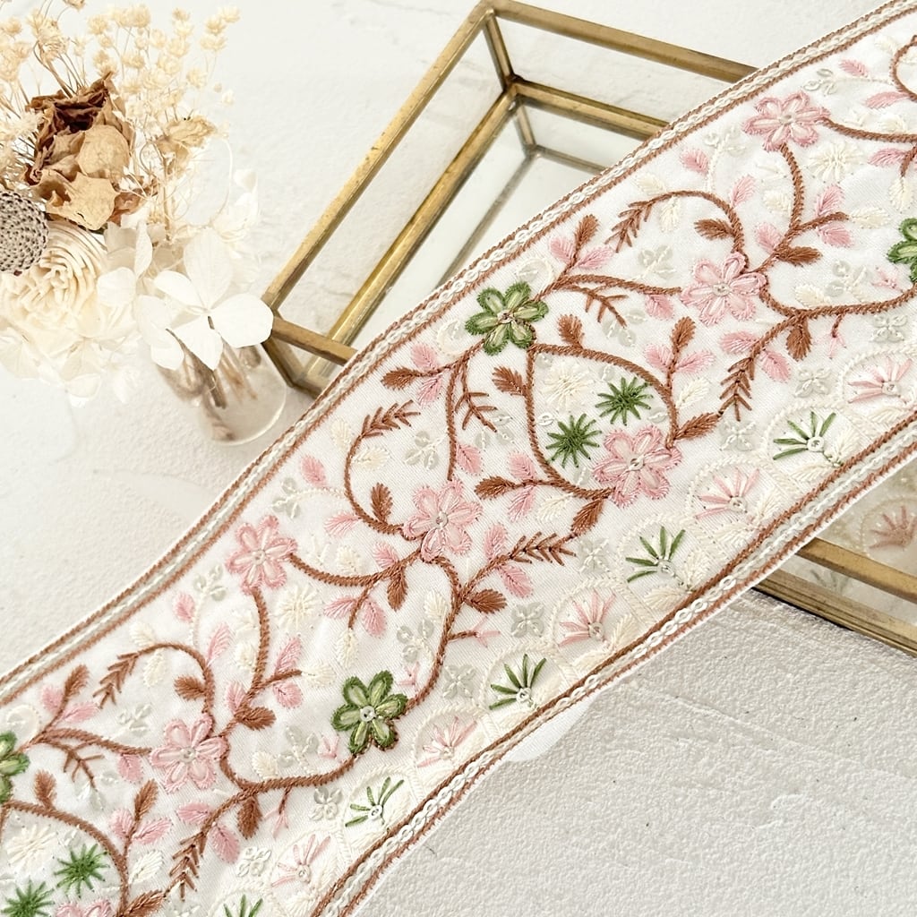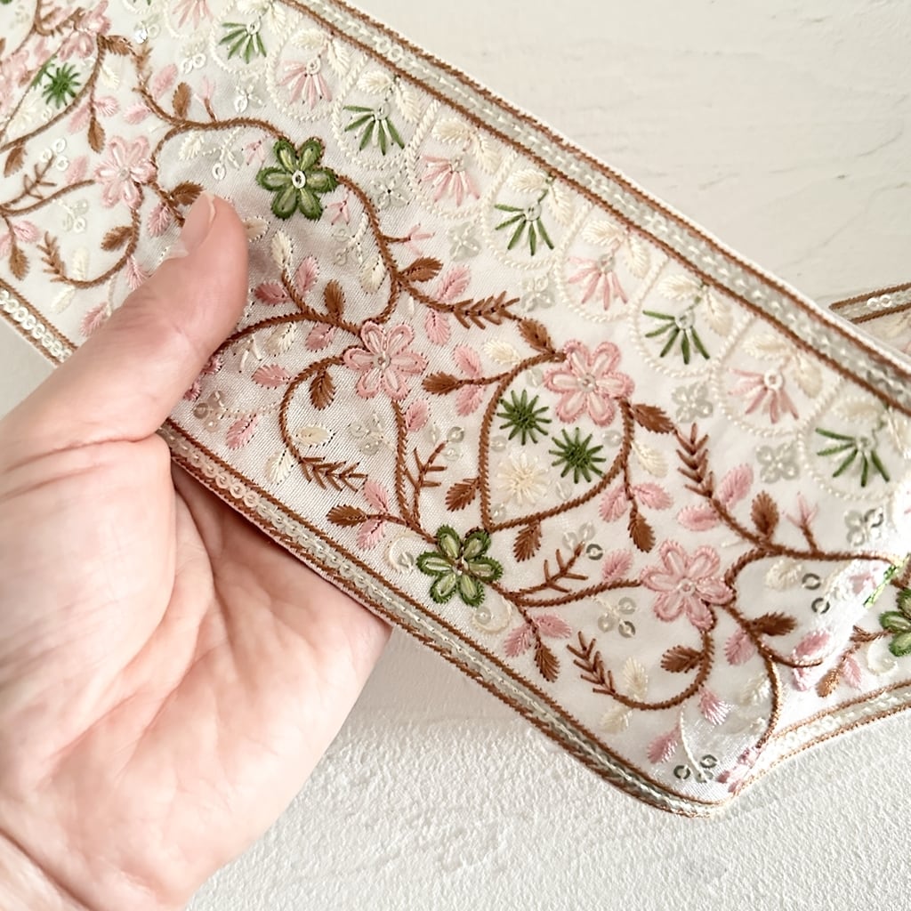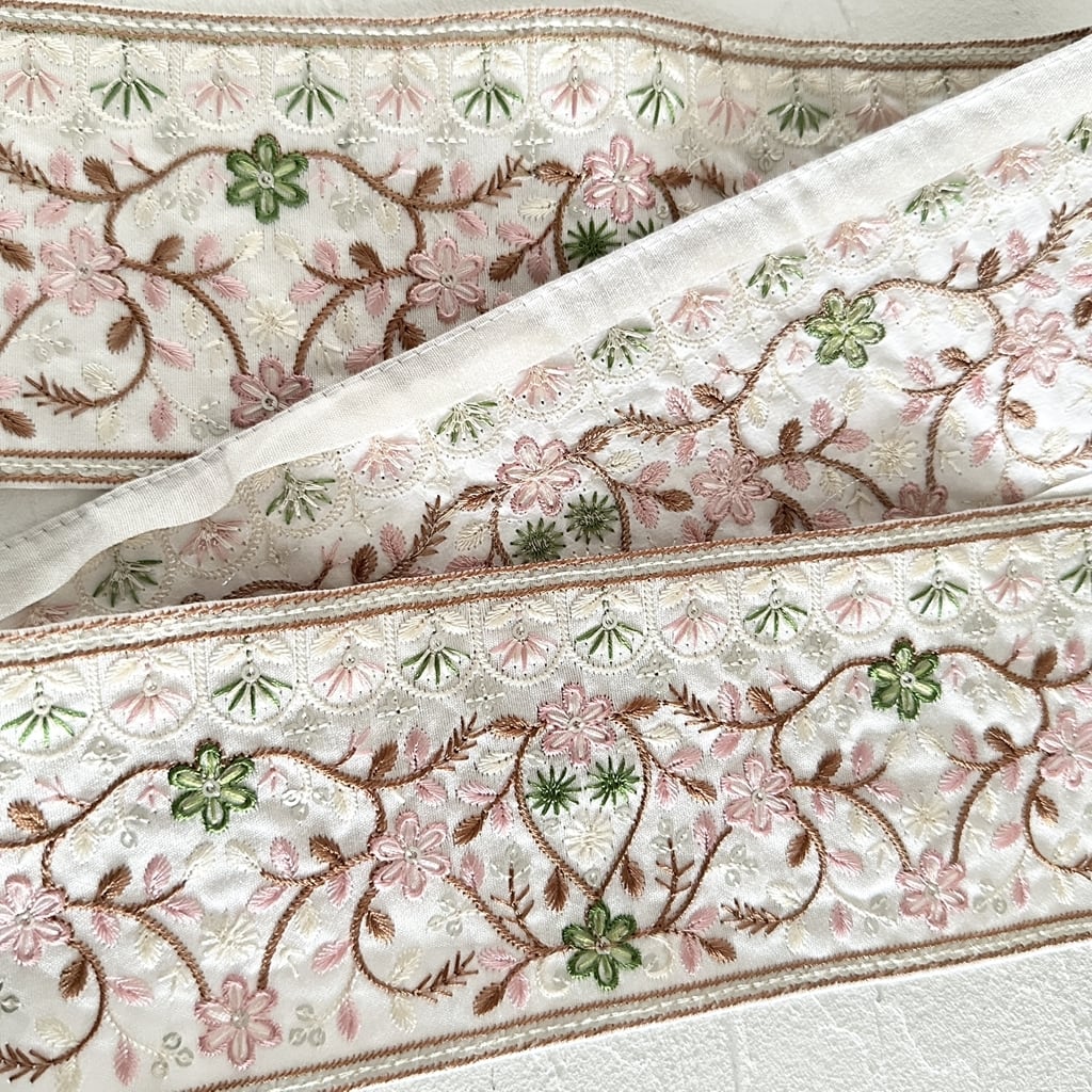 インド刺繍リボンは、細かい刺繍が施されていて色も鮮やかなリボンです。