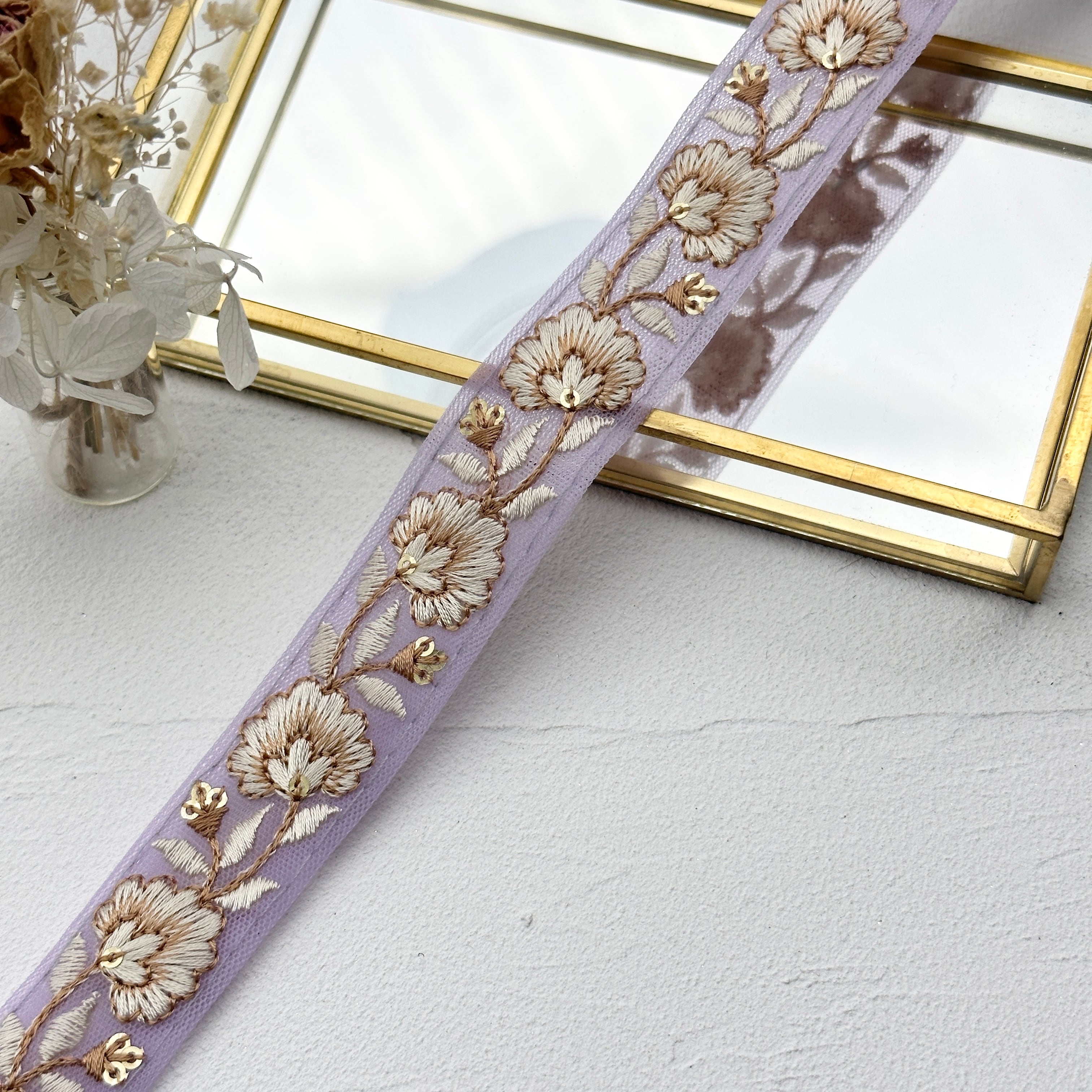 インド刺繍リボン ベージュフラワー [パープル] 1149
