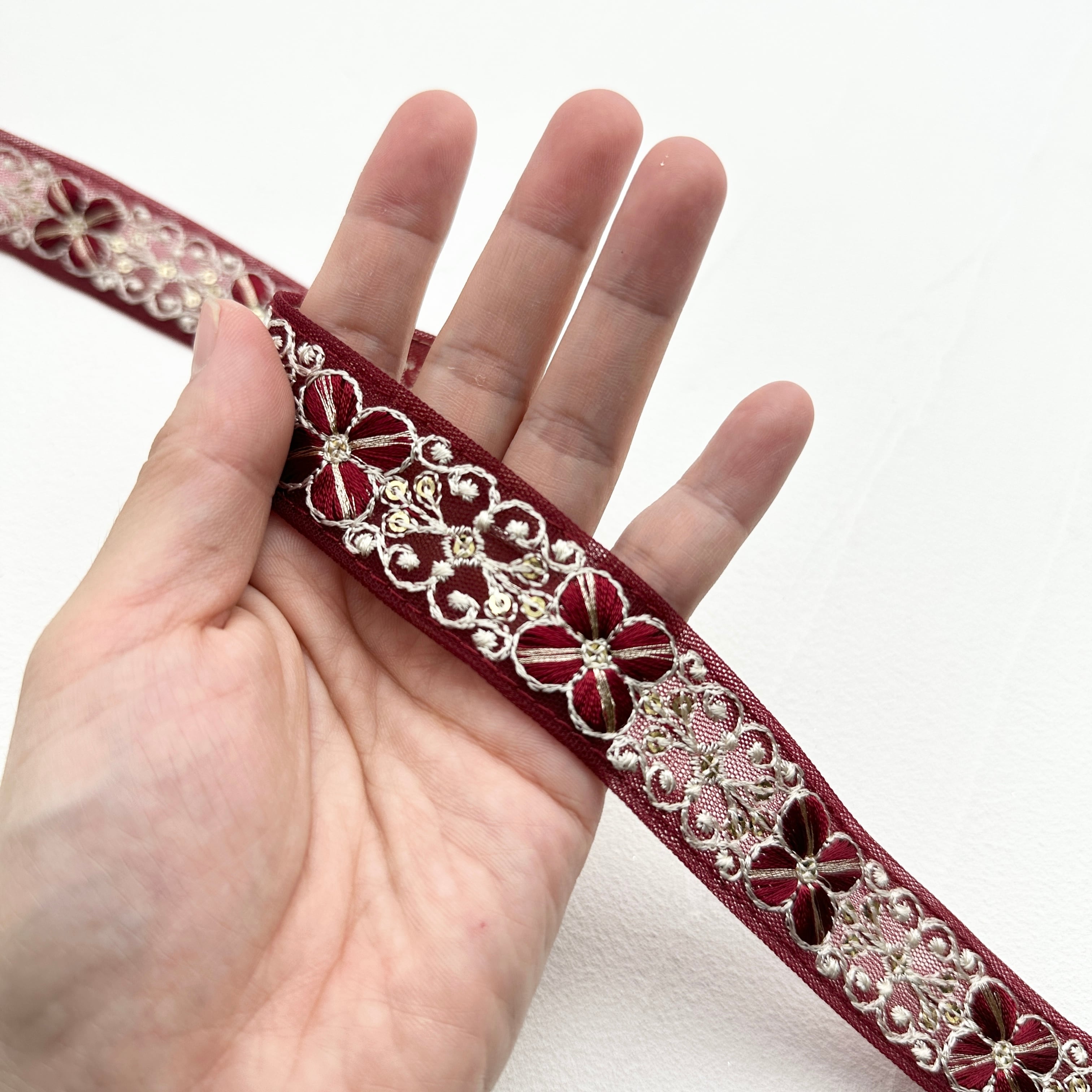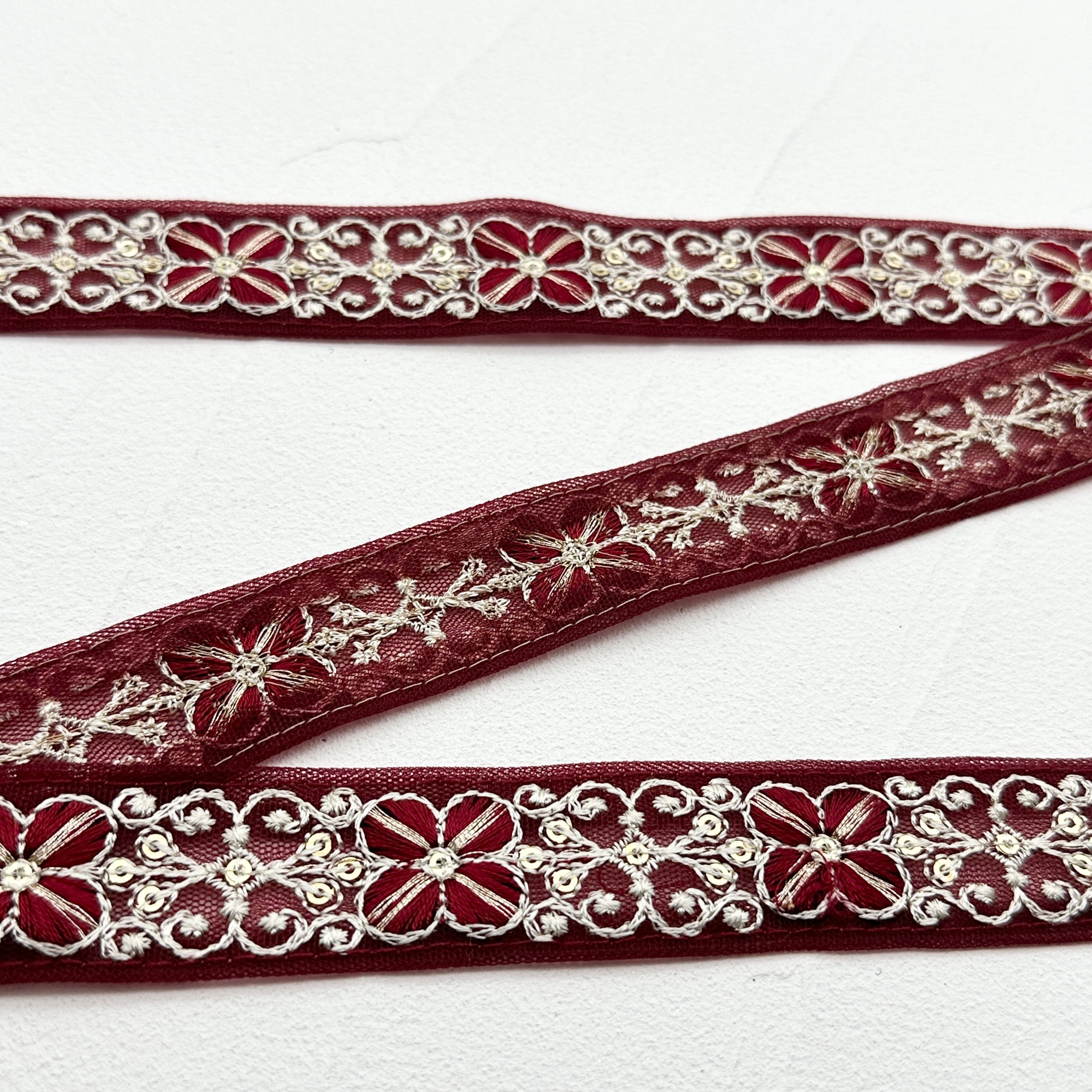 1ロール クローバー [ワインレッド] インド刺繍リボン 1091