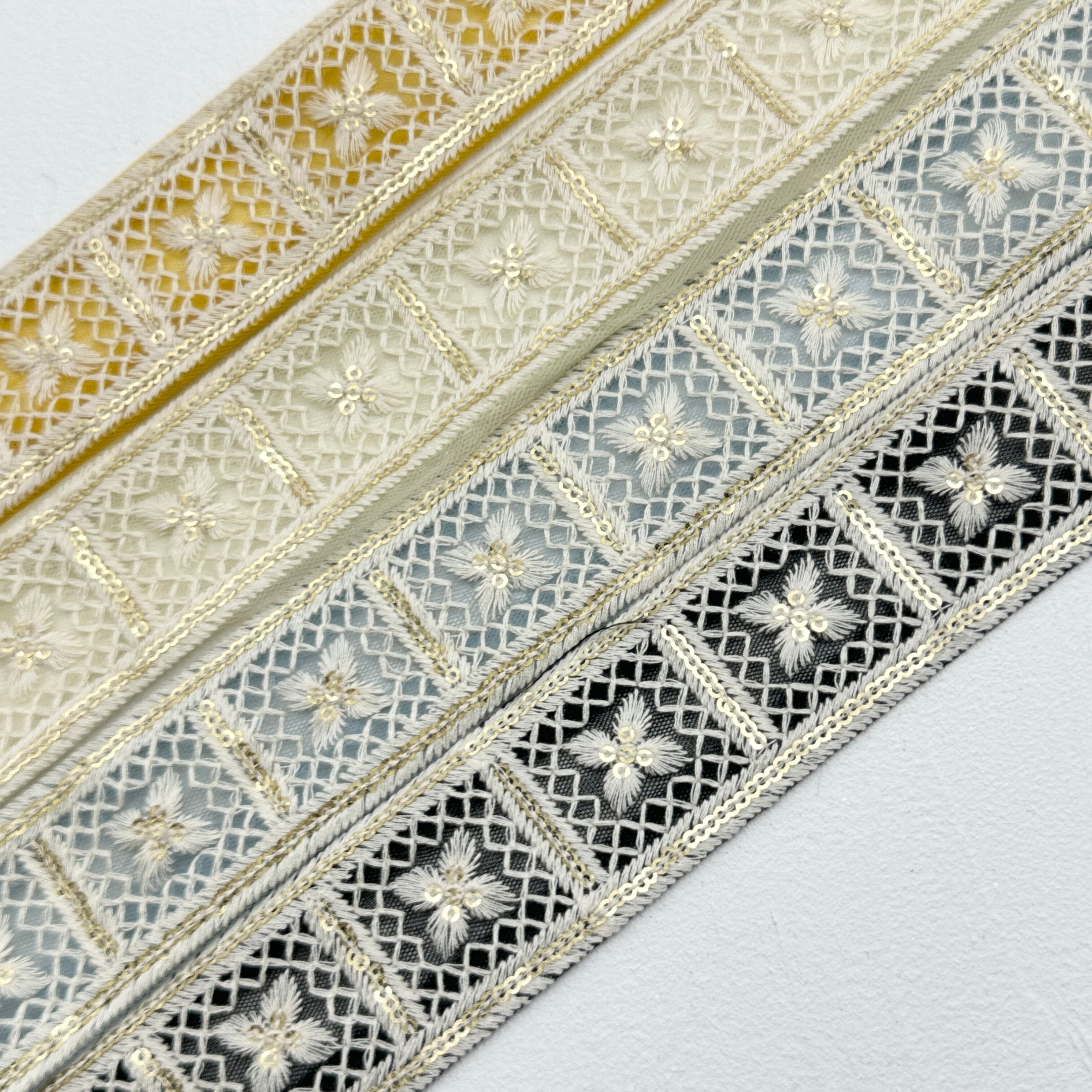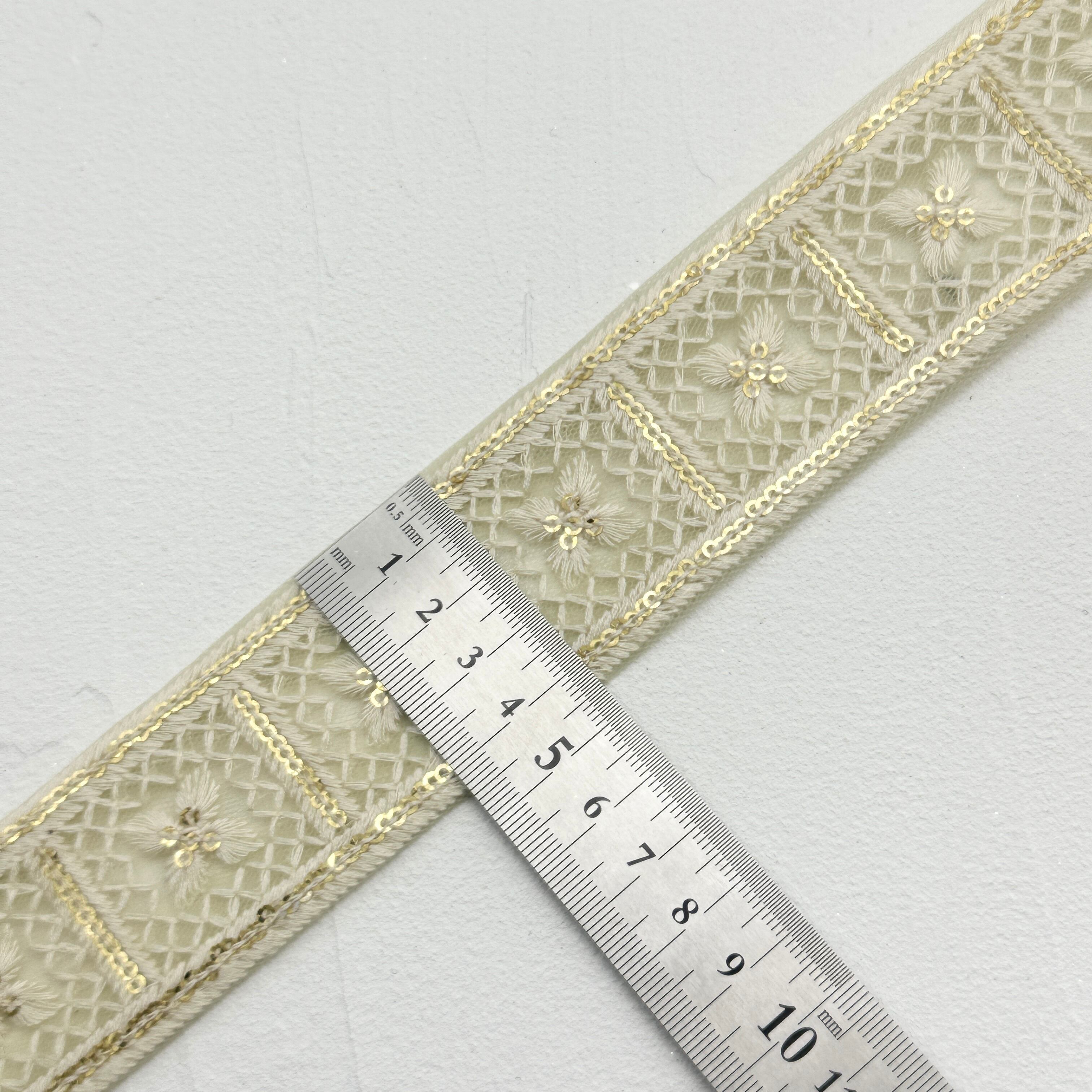 クロススクエア [ホワイトグリーン]インド刺繍リボン 1385