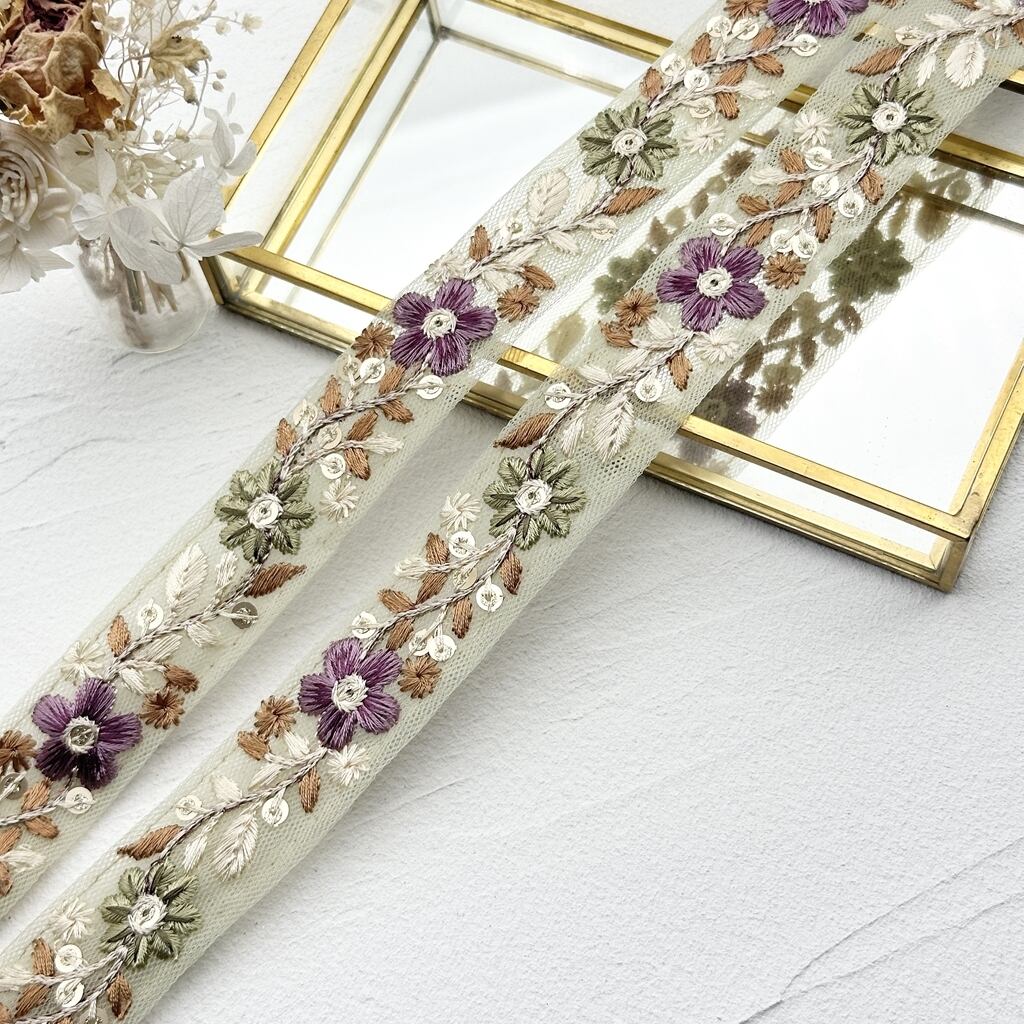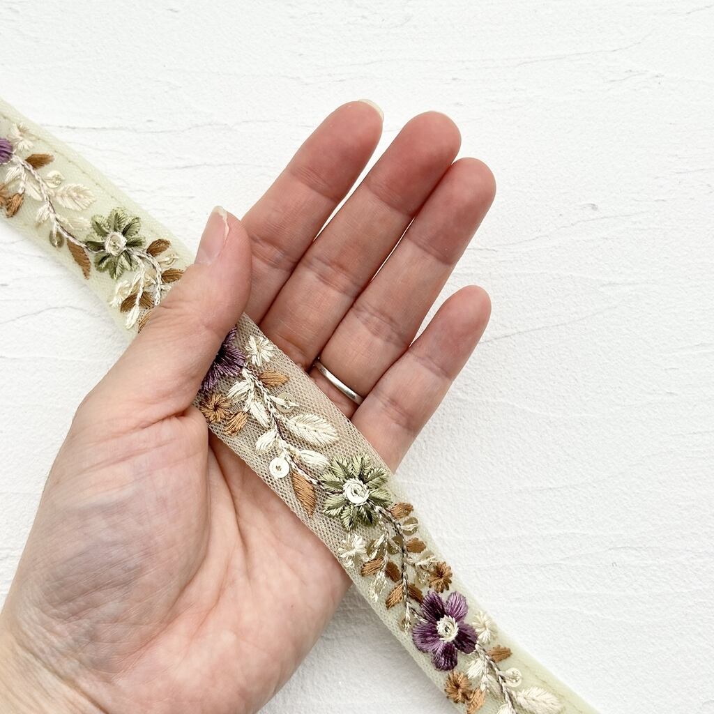 フラワーピュア [オリーブ]インド刺繍リボン 1802