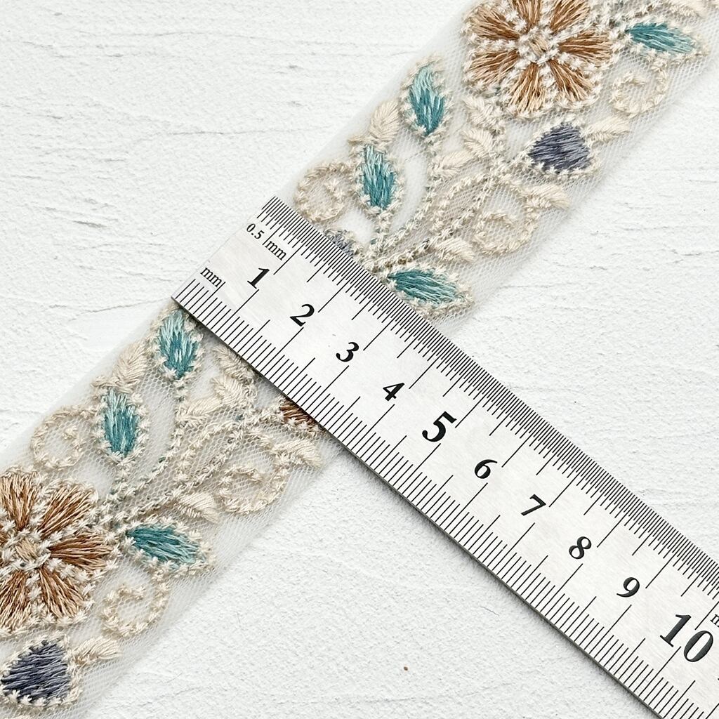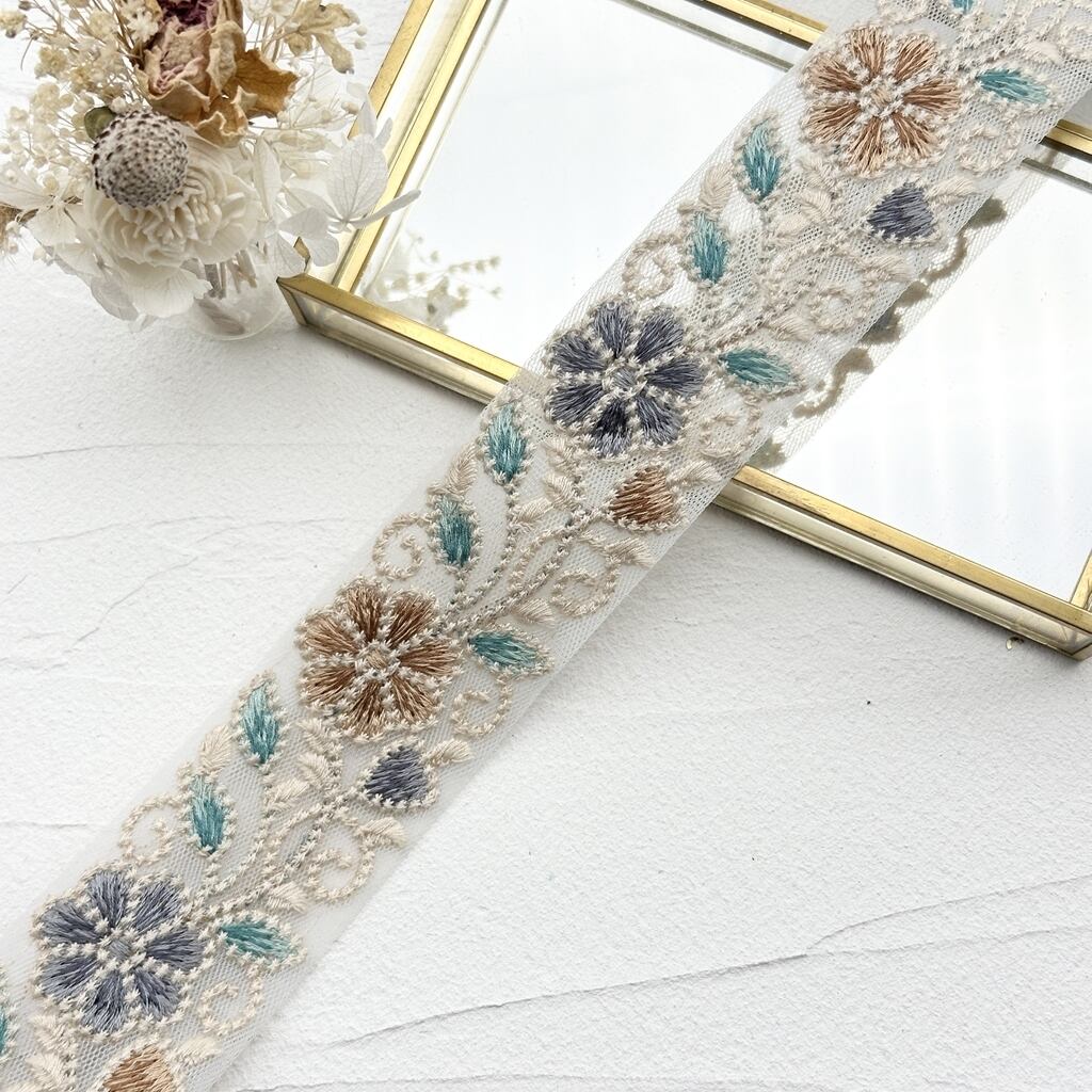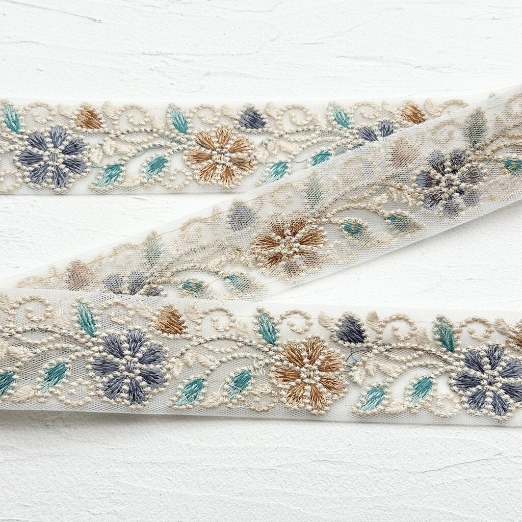 パステルダリアミニ [ブルーブラウン]インド刺繍リボン 1844