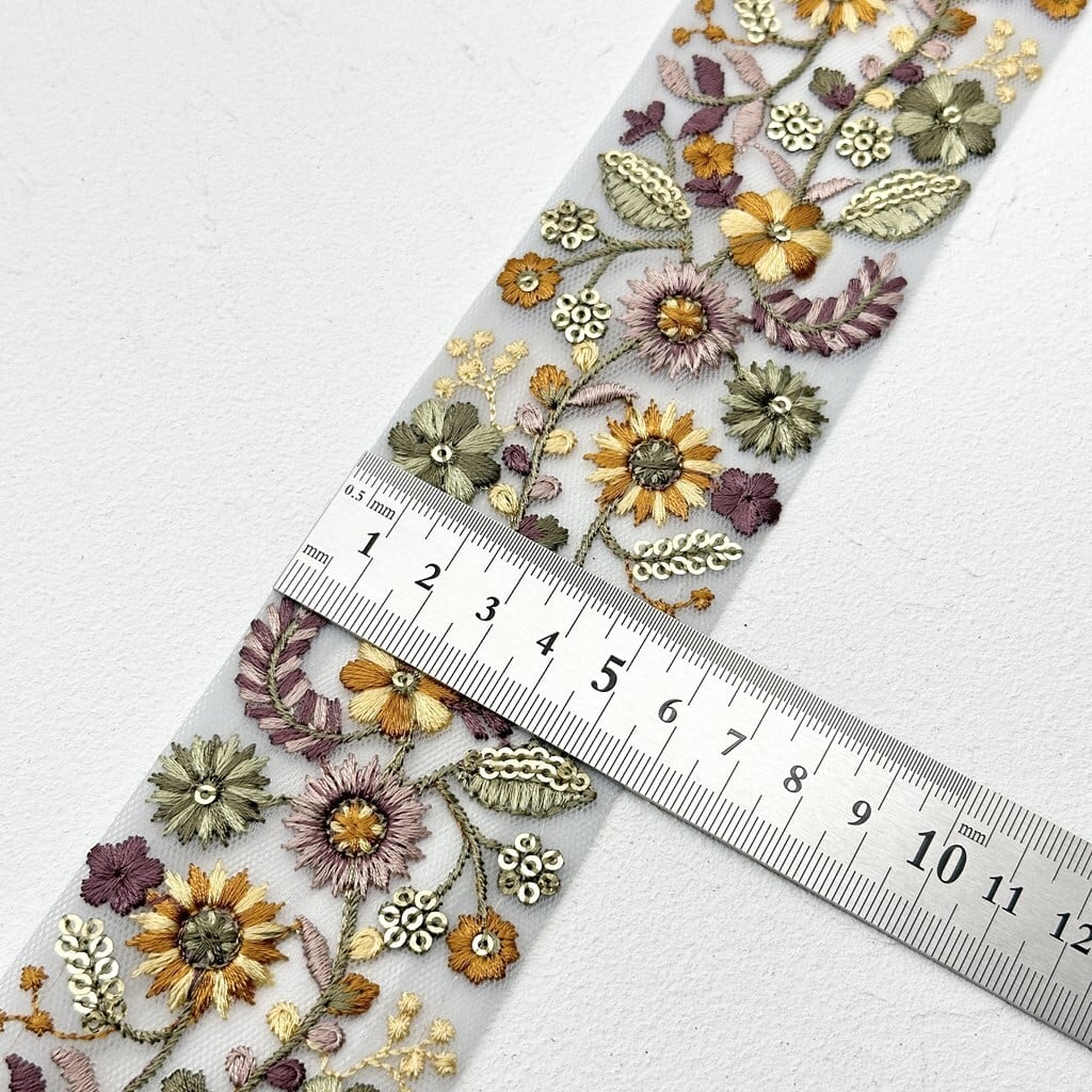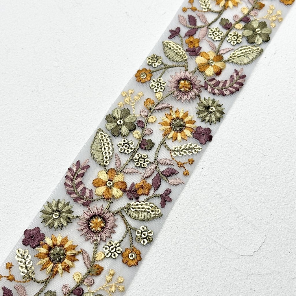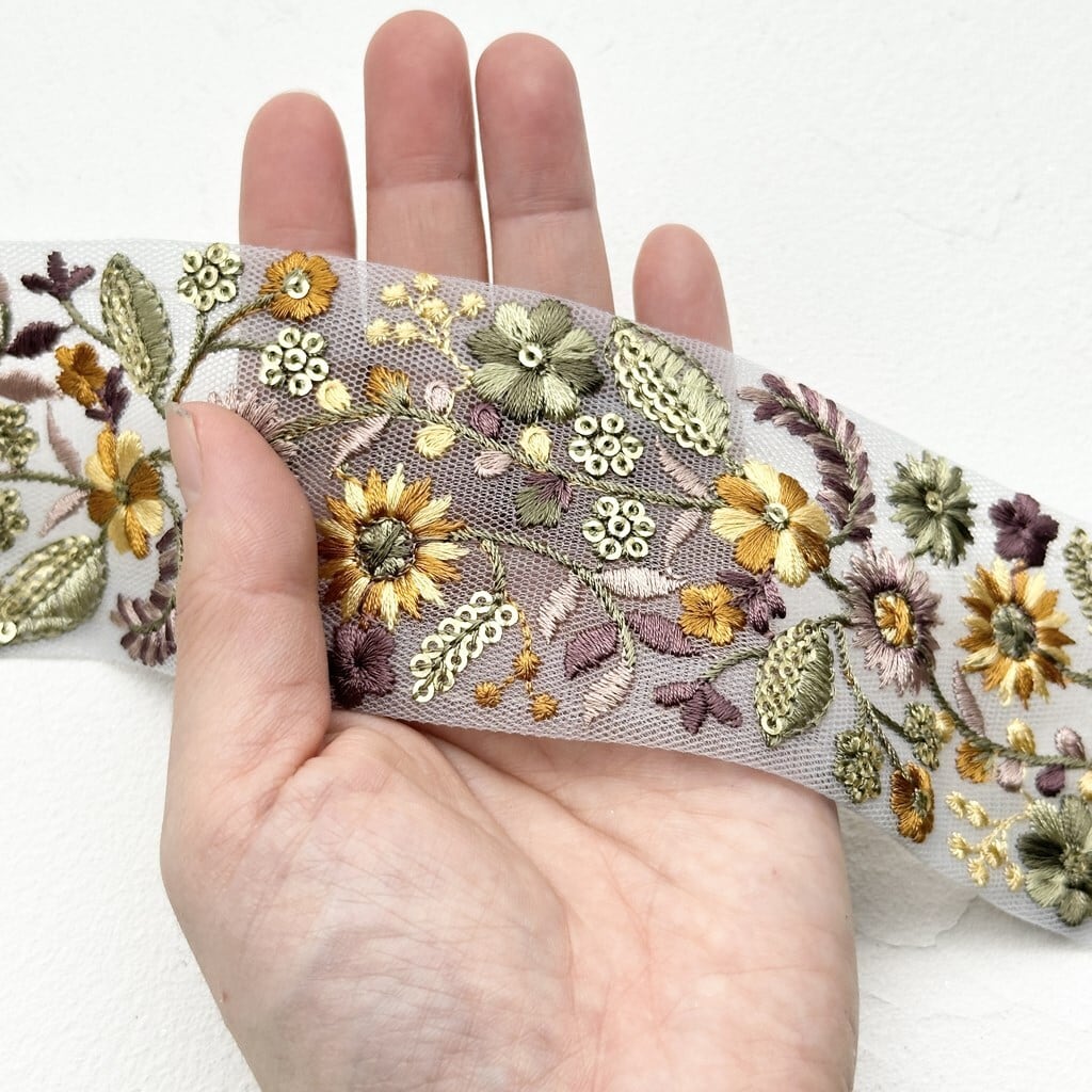 1ロール ミックスガーデン [イエローグレー]インド刺繍リボン 1531-1R