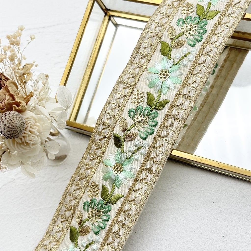 フラワーキス [エメラルドアイボリー] インド刺繍リボン 2380