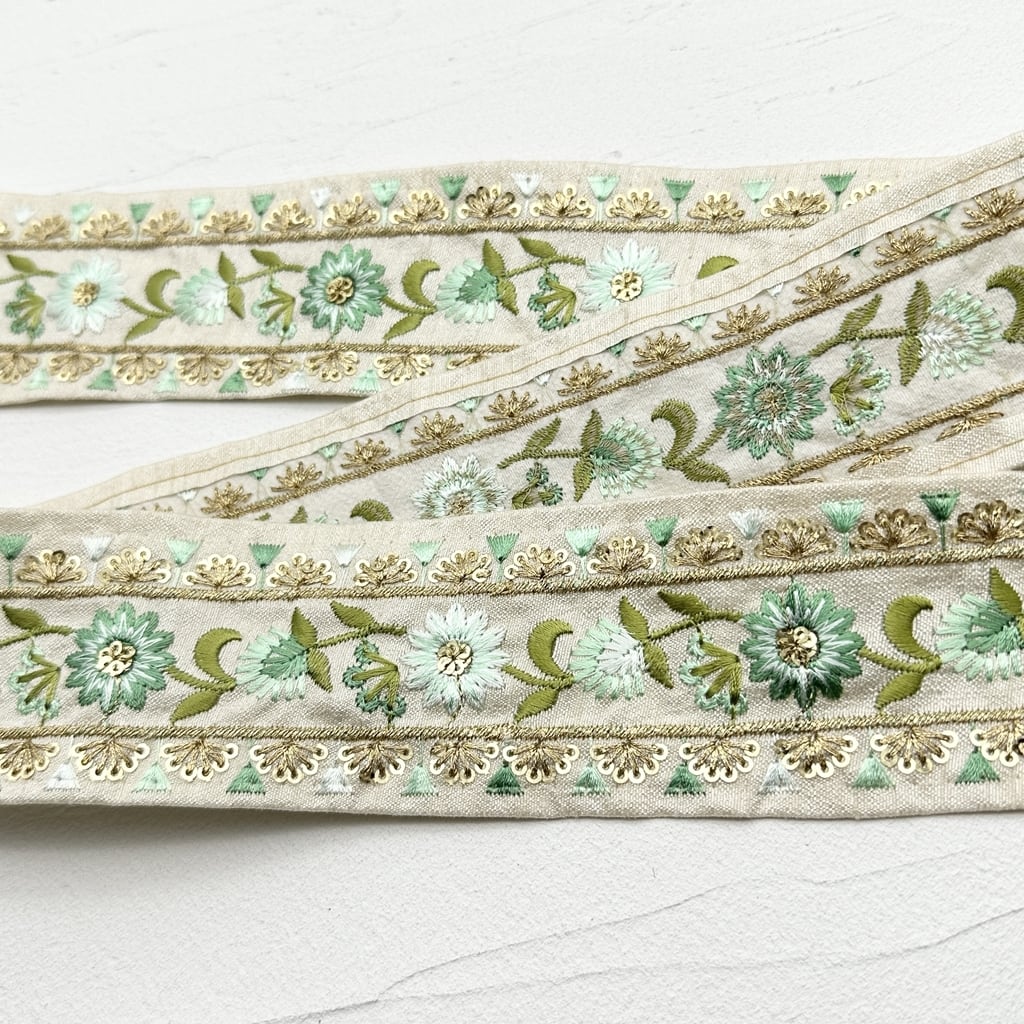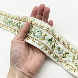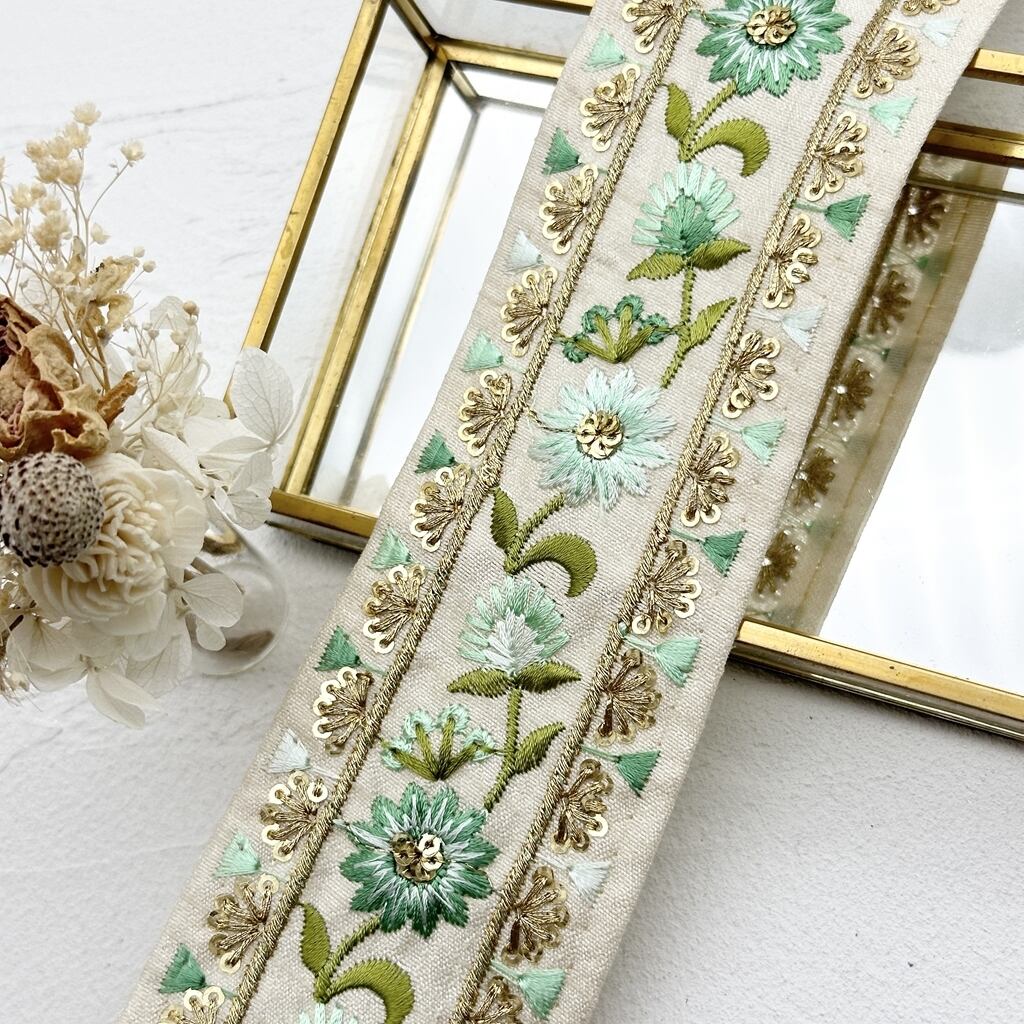 フラワーフェア [エメラルド] インド刺繍リボン 2385