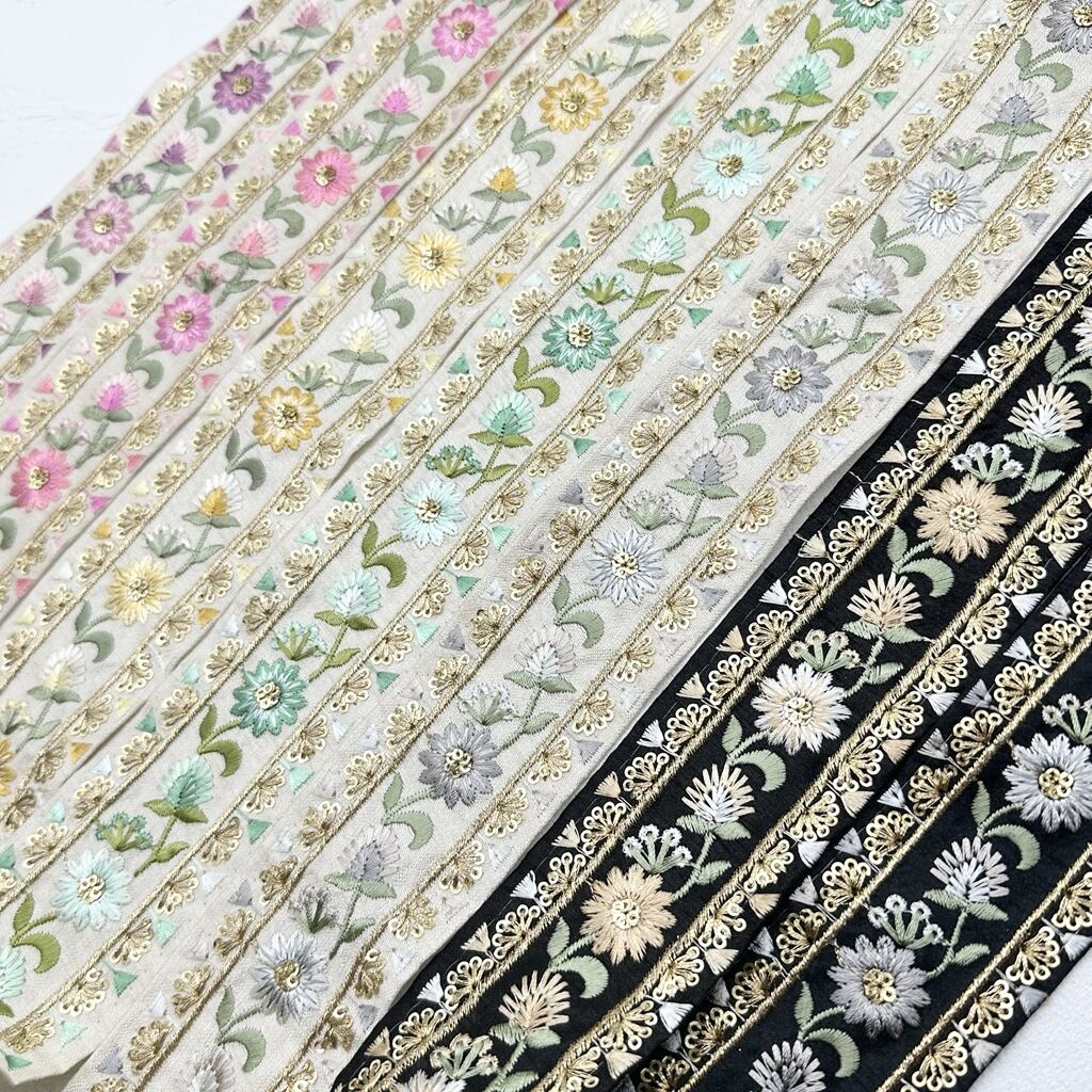 インド刺繍リボンは、細かい刺繍が施されていて色も鮮やかなリボンです。
